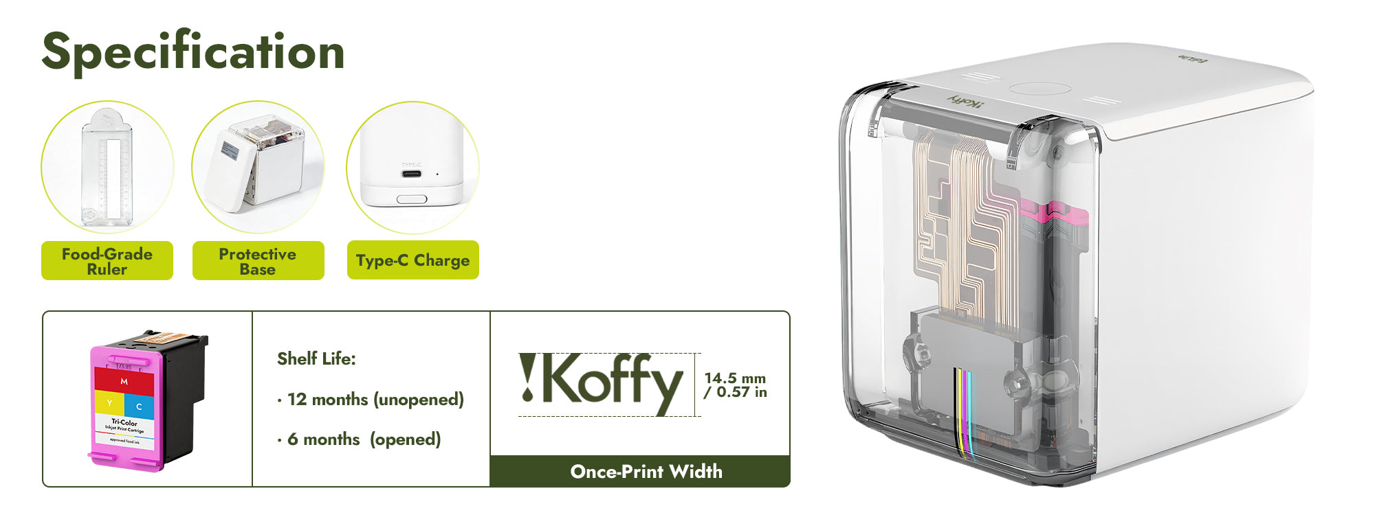 • Food-Grade CMY Cartridge — Safe, Clean, Easy to Replace:Plug-and-print food-grade CMY ink cartridge. Mess-free, easy to replace, with built-in sealing to prevent drying.