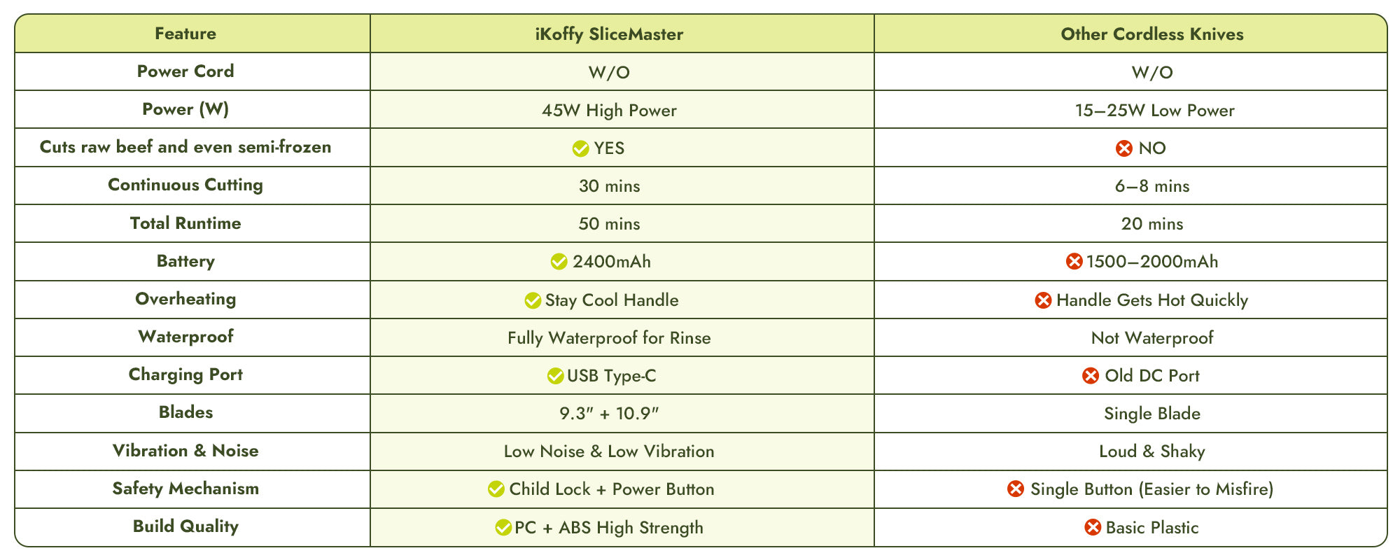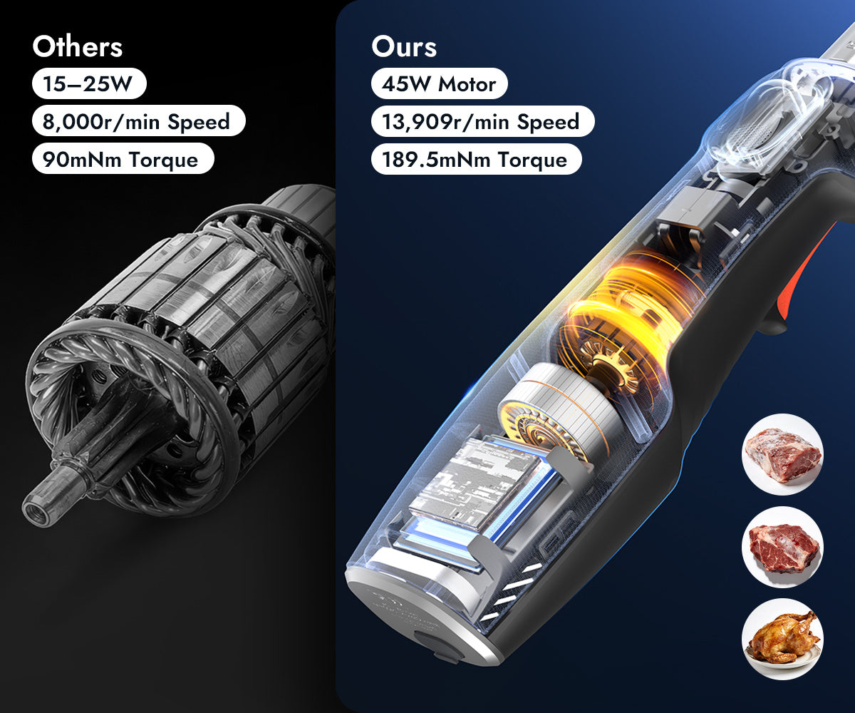 Traditional corded knives restrict movement and raise safety concerns around water. Most cordless knives sacrifice power and overheat within minutes. SliceMaster breaks both limits—delivering strong, high-torque cutting with long, uninterrupted runtime, all in a safer, fully cordless design.