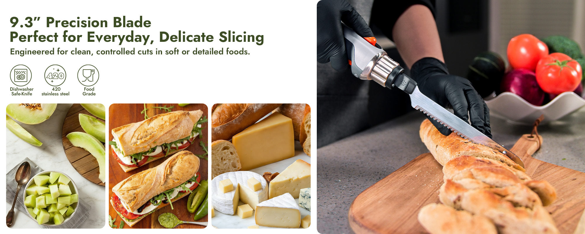 Comes equipped with dual professional blades and a carving fork to cover everything from meats and poultry to bread and large ingredients. Swap blades easily to match the task and achieve clean slices, controlled carving, and better presentation every time.